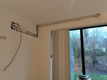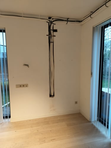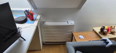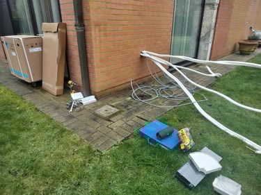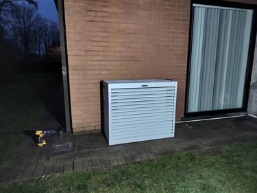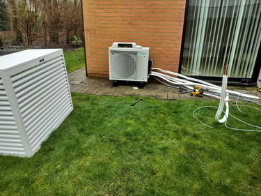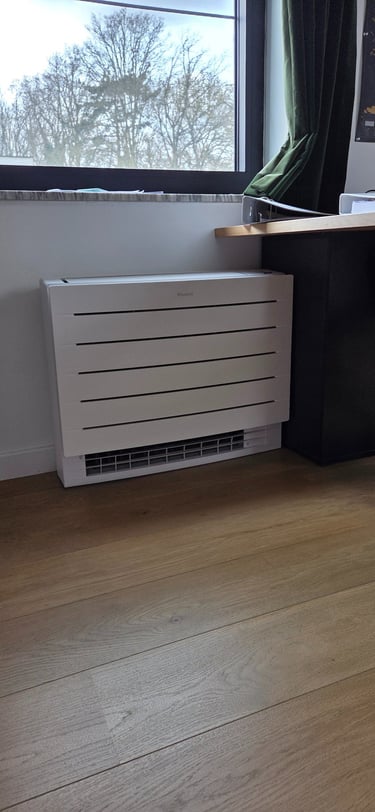 Daikin multi-split installatie met 4 binnentoestellen voor de verwarming en koeling van 4 slaapkamers. 2 vloer (1e verdieping) en 2 wandmodellen op gelijksvloers. De leidingen werden waar mogelijk in de muur gestoken en op andere plaatsen later door de klant omkast met MDF zodat dit dan geschilderd kan worden. Hierdoor was het mogelijk om te werken zonder kabelgoten op de buitengevel. Voor de buitenunit wou de klant een omkasting in het wit omdat hij later nog de gevel wit ging schilderen. Op deze manier word het een strak geheel.