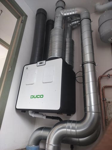 Hier heeft men 19 woningen gebouwd met allemaal ventilatie systeem-D. De opbouw van de installatie gebeurd in de eerste fase van de werf. De kernboringen en leidingen leggen gebeurd als allereerste stap in het proces. In de afwerkingsfase worden alle buizen aangesloten op de ventilatiekast. Hier is gewerkt met Duco wegens de uitstekende prijs-kwaliteit van Duco.
